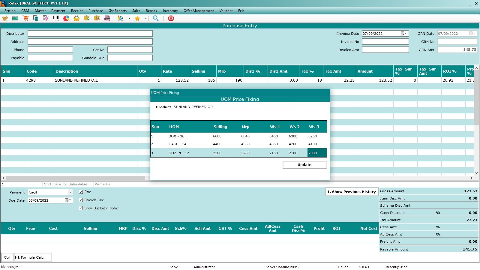 A unit of measurement (UOM) is the unit that any given item can be packaged into, or built into a product assembly. For example, you can package drinks in a single can, two-liter bottle, or other six-pack. Relax allows you to setup Multiple UOM like case, box, dozen, etc. for any items and their UOM can be mapped with the items.
